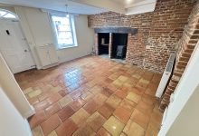 Brick fireplace, Inset “Morso” inset wood burner, shelving recess to one side, double paved hearth, sash window to front aspect, exposed brickwork, tiled floor, TV point and passageway leading to;