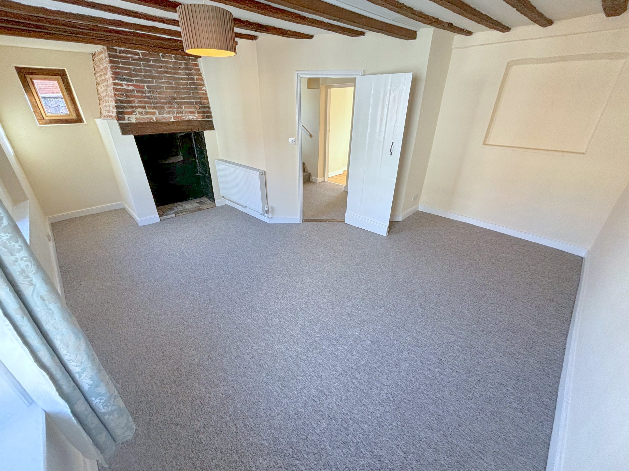 Timber floor, exposed beams, brick fireplace with beam mantle and brick hearth, two sash windows to front aspect,