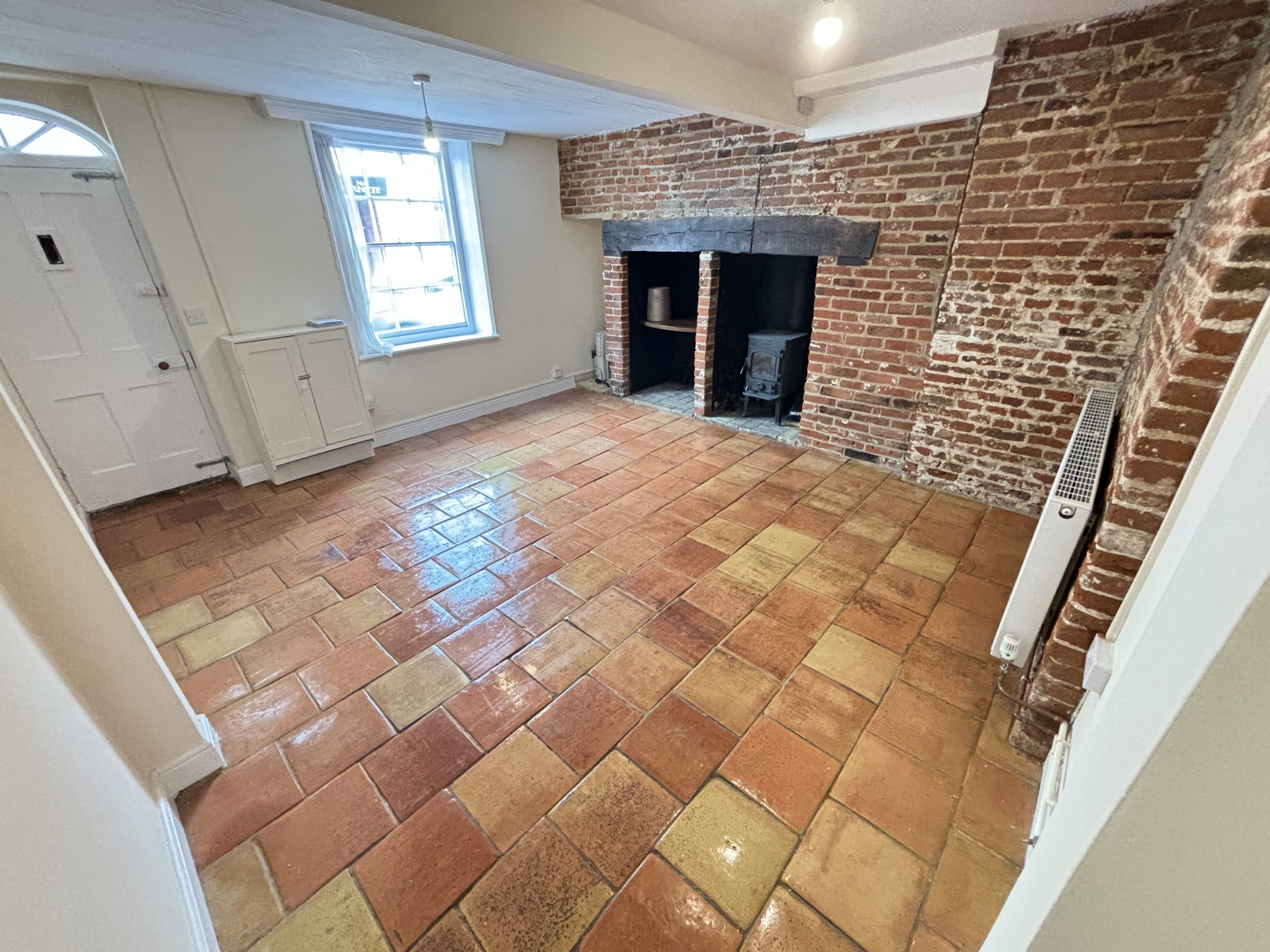 Brick fireplace, Inset “Morso” inset wood burner, shelving recess to one side, double paved hearth, sash window to front aspect, exposed brickwork, tiled floor, TV point and passageway leading to;
