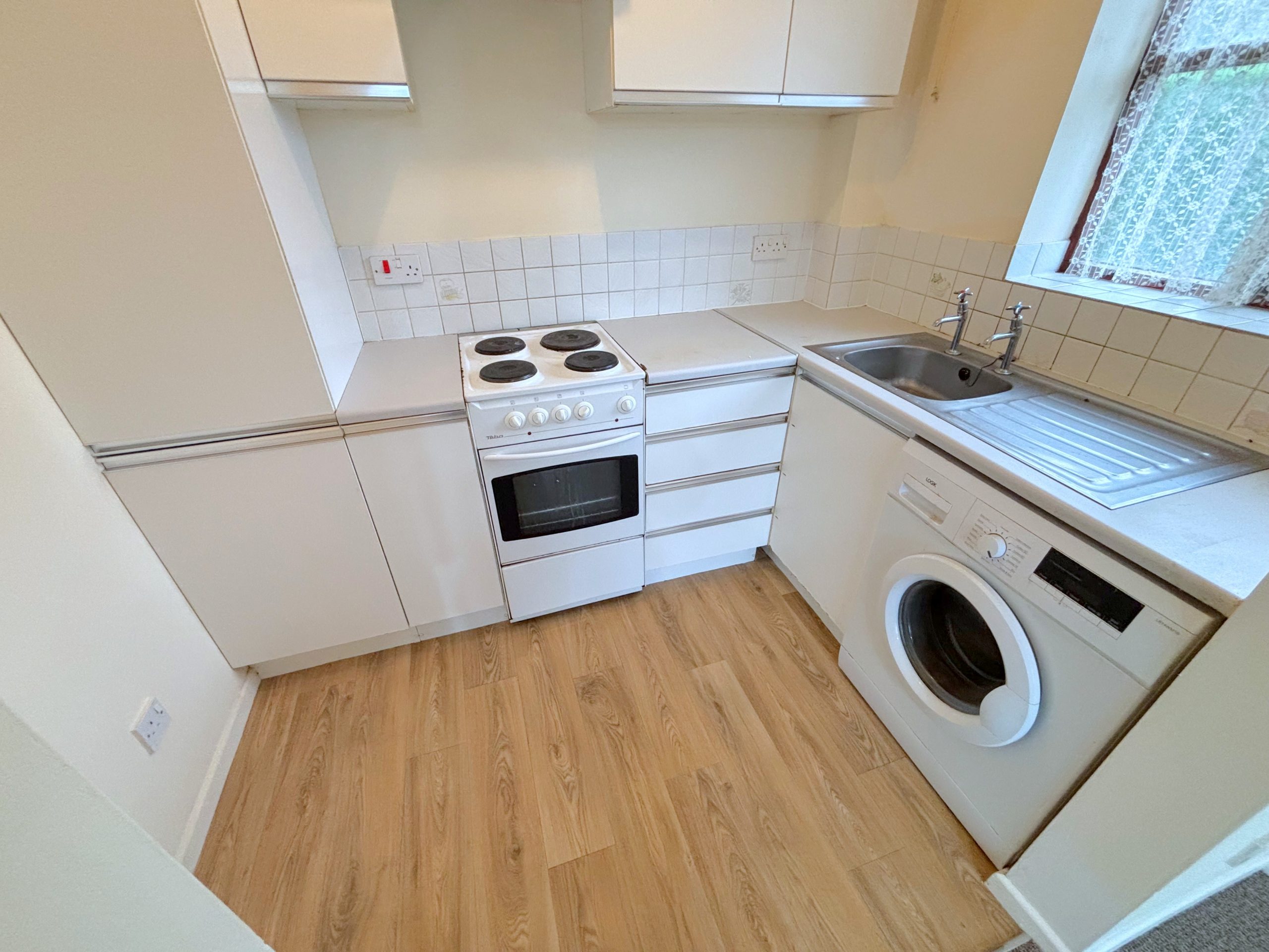 Kitchen comprises of range of fitted cupboards and drawers with alcoves for washing machine and electric cooker
